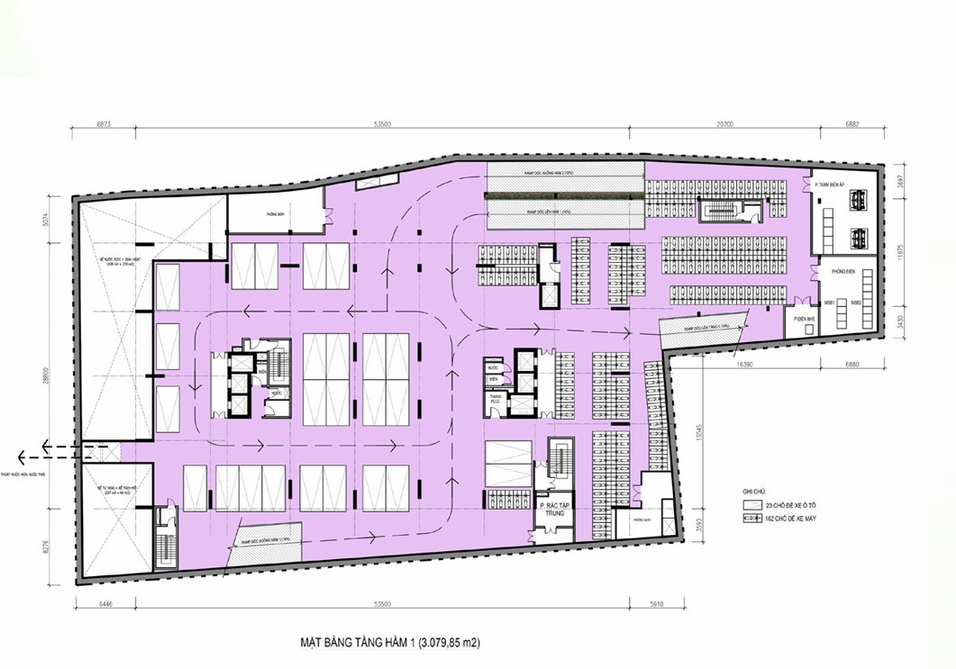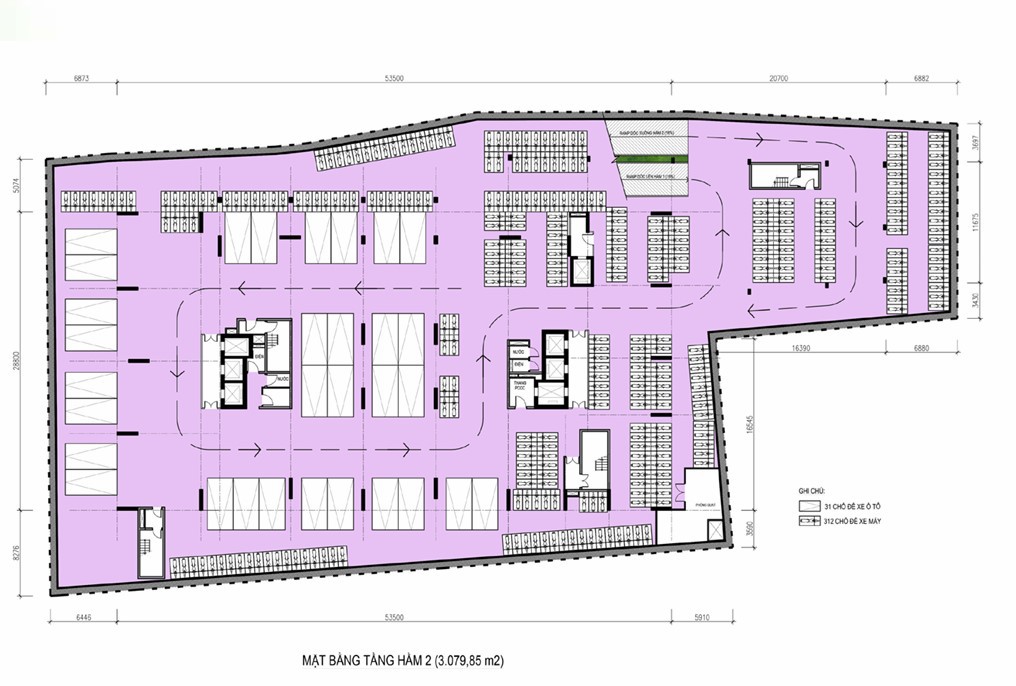 Mặt bằng tầng hầm: Tầng hầm 1 có 23 chỗ để xe ô tô và 162 chỗ để xe máy. Tầng hầm 2 có 31 chỗ để xe ô tô và 312 chỗ để xe máy.