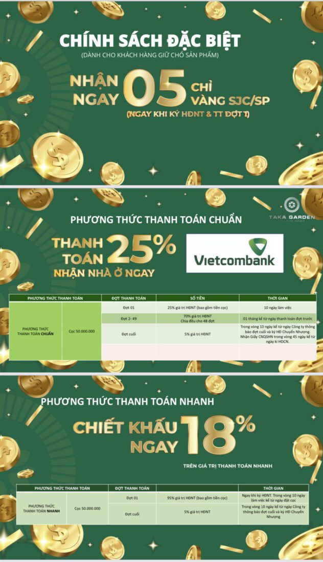 Khách hàng khi mua tại dự án Taka Garden Riverside Homes sẽ có nhiều cách thanh toán linh động. Đối với khách hàng có nhu cầu sẽ có chính sách vay vốn từ ngân hàng Vietcombank từ 70%, chủ đầu tư hỗ trợ 24 tháng đầu tiên không tính lãi.