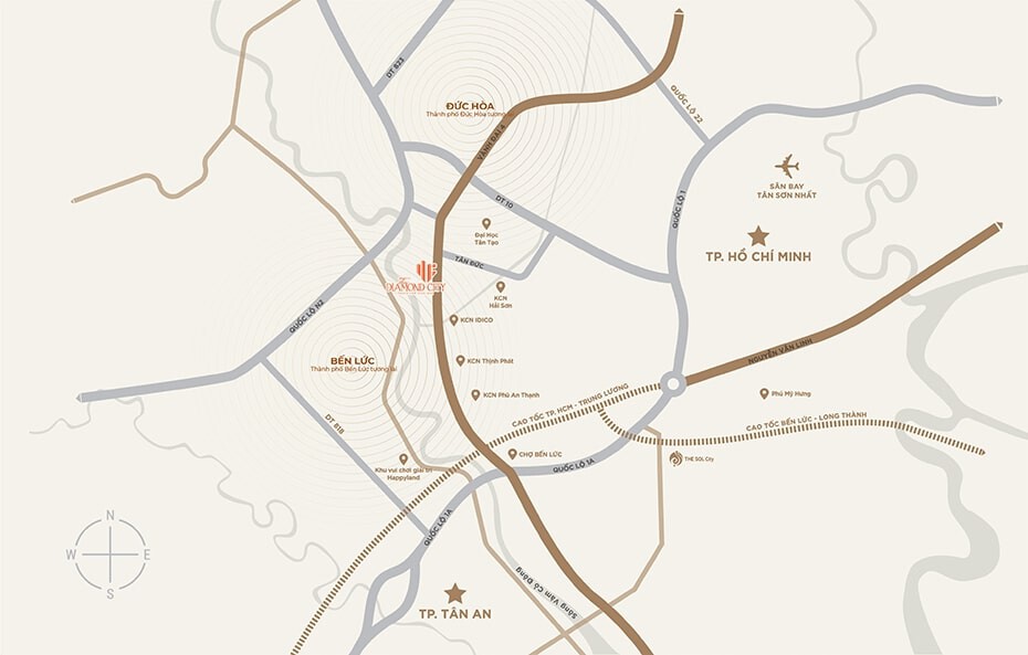 - Vị trí The Diamond City nằm ở rìa phía Bắc, là cửa ngõ kết nối TP. HCM – Long An – Tây Ninh. Dự án cũng có lợi thế về hạ tầng giao thông khi dễ dàng kết nối với Quốc lộ 62, Quốc lộ 1A, cao tốc TP. HCM – Trung Lương,… Điểm mạnh của vị trí dự án The Diamond City chính là liền kề nhiều KCN quy mô lớn.