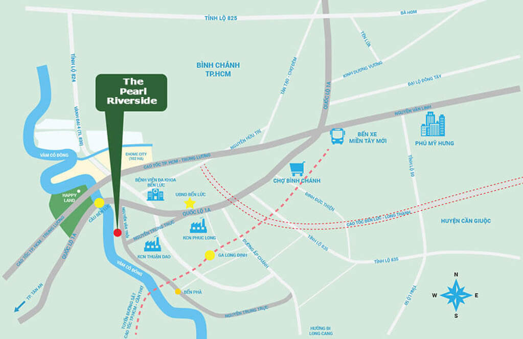 - Vị trí The Pearl Riverside nằm ở mặt tiền đường Nguyễn Văn Tuôi, ngay trung tâm của thị trấn Bến Lức, gần trung tâm hành chính của huyện, dễ dàng di chuyển đến TP. HCM thông qua tuyến cao tốc Bến Lức – Long Thành. Ngoài ra, vị trí dự án còn liền kề sông Vàm Cỏ Đông đem đến các lợi thế về không gian sống.