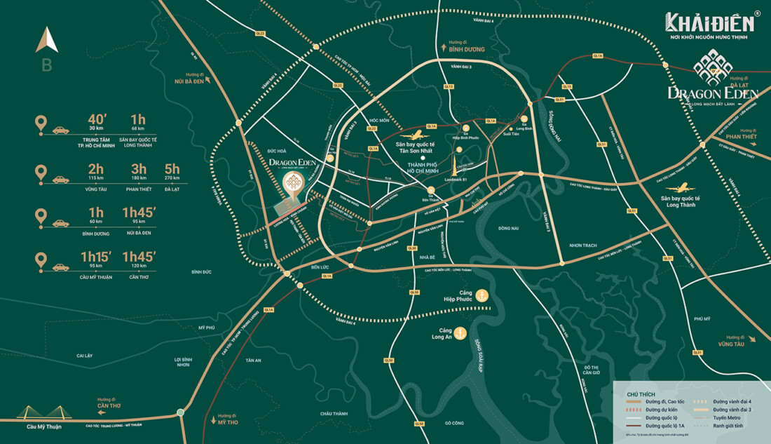 Dragon Eden – Khu dân cư Mai Bá Hương có diện tích 146,8 ha, thuộc khu vực cửa ngõ Tây Nam TP.HCM, tiếp giáp vùng phát triển công nghiệp – thương mại mạnh của Long An. Vị trí dự án kết nối thuận tiện với tuyến Lương Hòa – Bình Chánh, đường tỉnh 824, và các trục giao thông lớn hướng về TP.HCM cũng như Vành đai 4 trong tương lai.
