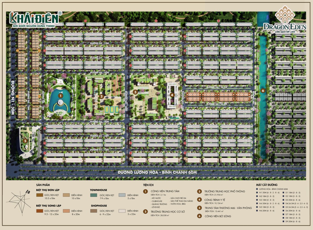 Dragon Eden Bến Lức sở hữu quy hoạch đồng bộ với mật độ xây dựng hợp lý. Hệ thống đường nội khu gồm các trục 18m, 20m, 35m, 60m và 102m, giúp lưu thông thuận tiện và tạo không gian đô thị thoáng đãng.